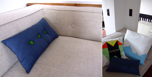 Afgelopen zomer waren we in Kopenhagen en een van de meest inspirerende winkels daar, was die van Hay. Daar zag ik de geweldige Dot Cushions, maar ik vond ze nogal duur. Toen ik op een rommelmarkt de perfecte knopen vond, bedacht ik me dat ik kon proberen om er zelf een te maken. Ben behoorlijk tevreden over het resultaat!
